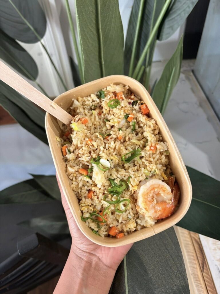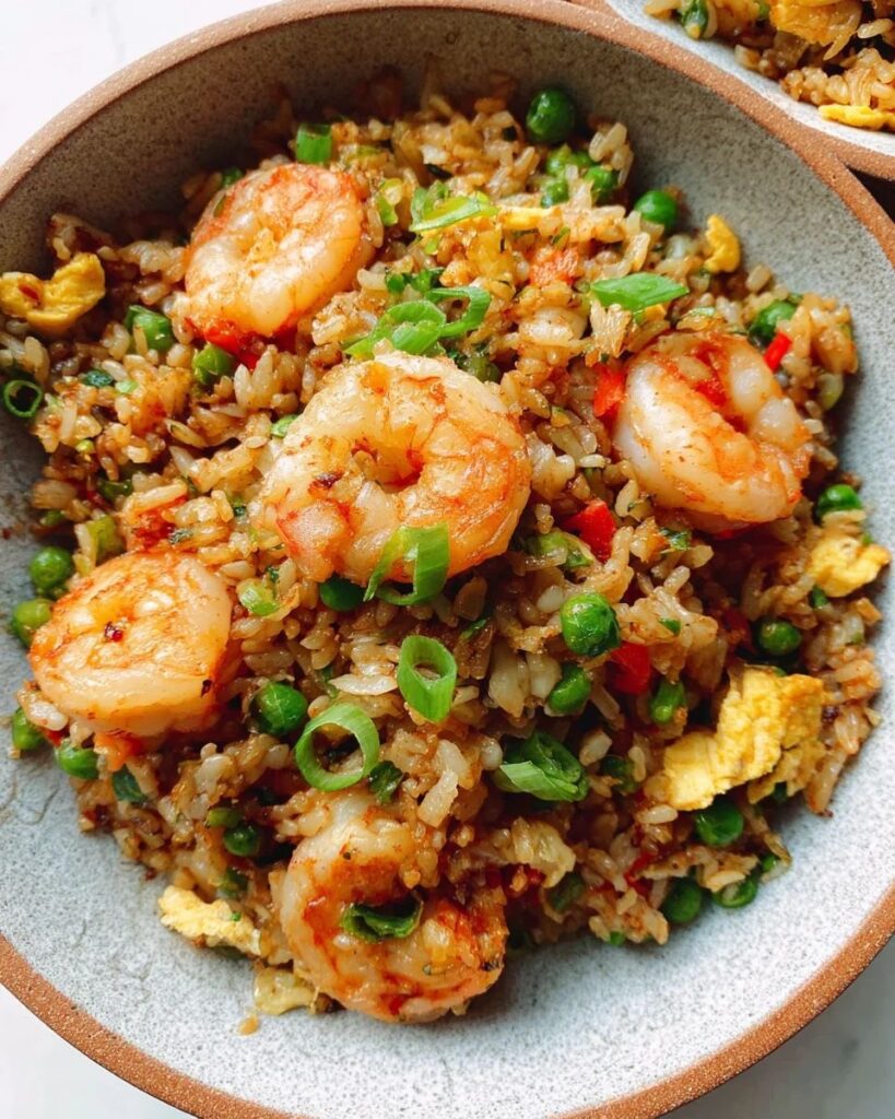 Wok-fried rice with juicy prawns, vegetables, and savory Asian spices.